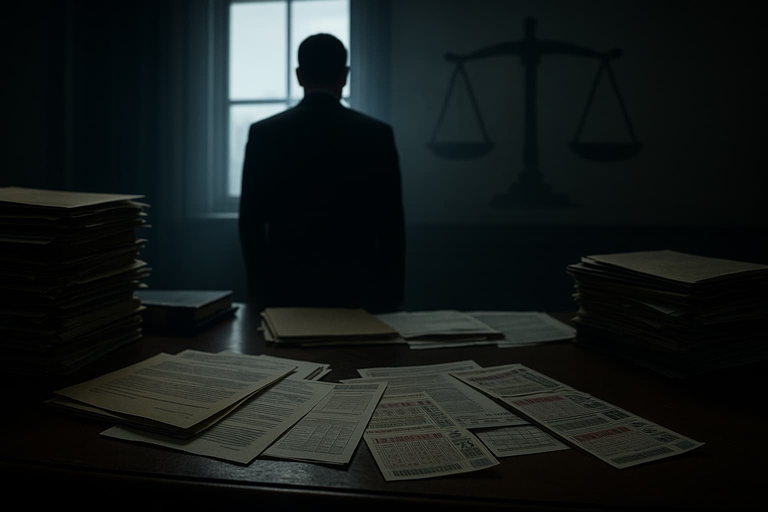 Despacho en penumbra con la silueta del perito y documentos sobre la mesa, simbolizando la sombra de la justicia en el caso Cerdán.